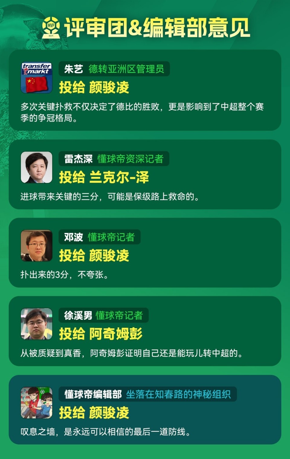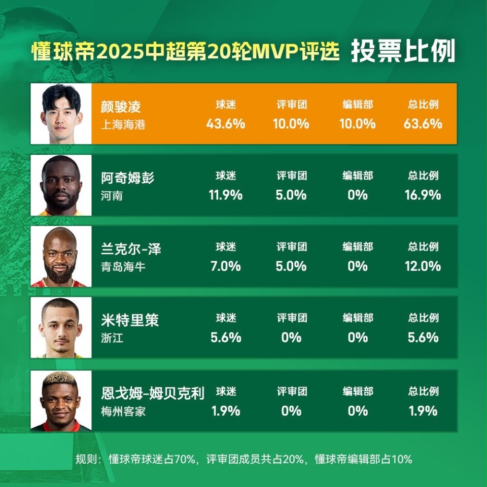 大家好,欢迎来到懂球帝2025赛季中超MVP评选现场。中超第20轮MVP得主出炉,上海海港门将颜骏凌凭借在德比大战的出色表现,以63.6%的高票当选本轮中超的MVP。这也是在2017赛季中超第4轮、2023赛季中超第29轮后,颜骏凌第3次获得中超MVP!